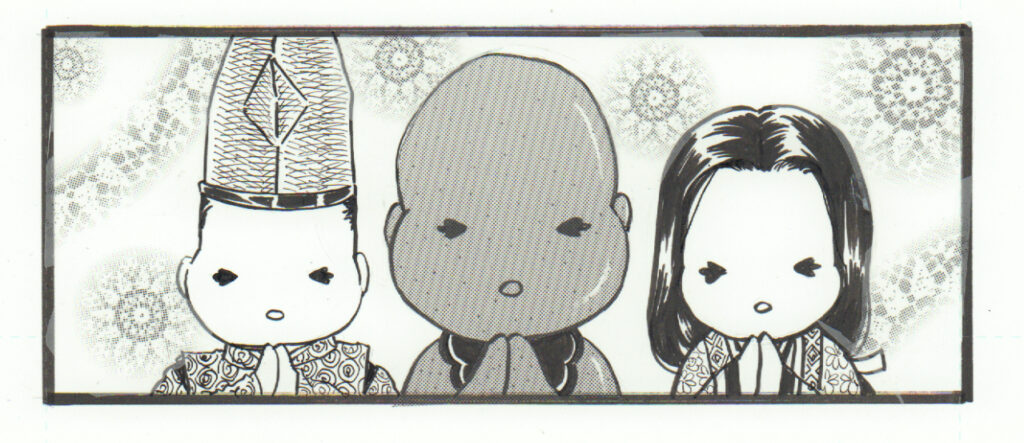 雑なストーリー③・一方、主の屋敷に三人の僧が訪ねてきました。僧達とティータイムであれこれおしゃべりしているうちに主はうっかり、ある者を殺そうと予定していたことを話してしまいます。すると僧達は青ざめて言いました。「今日は地蔵菩薩様の縁のある日だから絶対殺生は駄目ですよ!」そう聞いて主も恐ろしくなり、家の者に「殺すのを止めてきて!」と命令します。